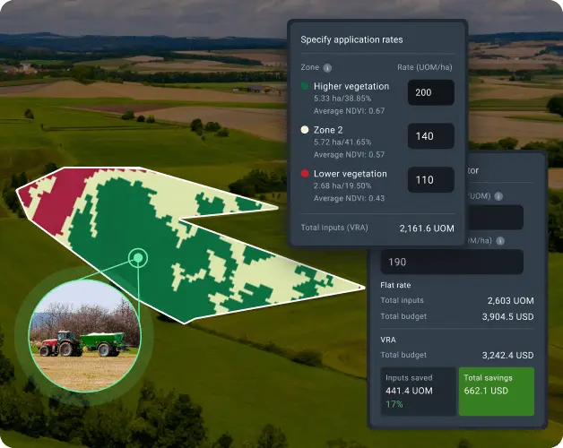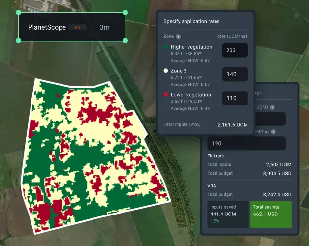 Accessing PlanetScope high-resolution images through WHY Crop Monitoring changed the game. With our crop growth monitoring system, the team pinpointed low NDVI areas that matched regions with poor nutrient uptake. They used EOSDA's variable rate application (VRA) feature to generate a nitrogen map tailored to each zone. Integrating PlanetScope images in