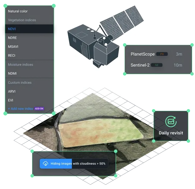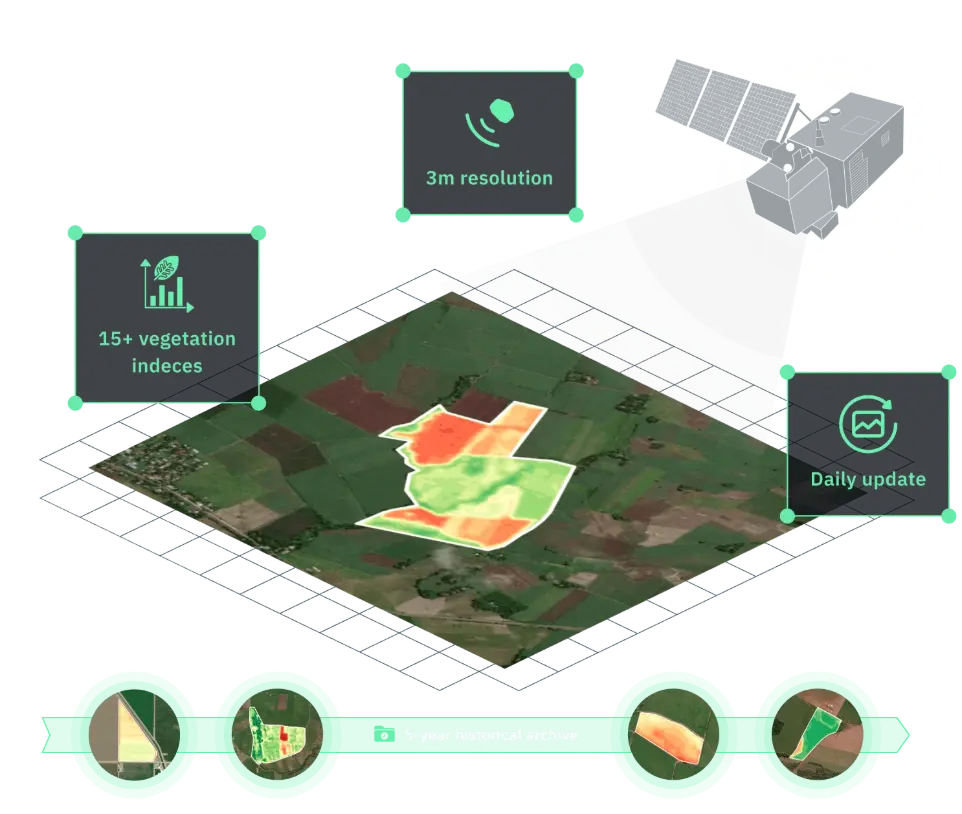 Frequent high-resolution farm satellite imagery gives you the edge needed to manage crops more precisely, efficiently, and confidently. Make informed decisions with current and historical images combined with powerful analysis and forecasting tools, all in one platform: