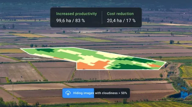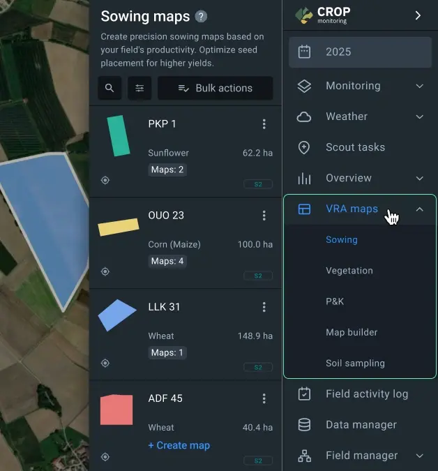 Create ready-to-use VRA maps in WHY Crop Monitoring and apply seeds, fertilizers, and crop protection just as much as needed. The system uses satellite data and field analytics to help you apply inputs at appropriate variable rates and save resources.