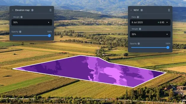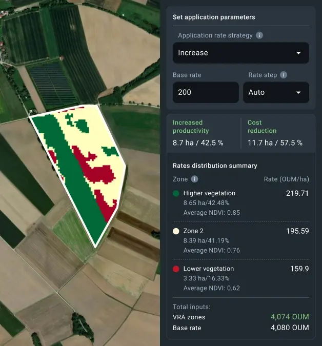 - How to use it: Select the field activity you want to perform at variable rates, and the system will automatically suggest the optimal settings and vegetation indices. Choose the latest cloud-free satellite image, select the number of application zones and detail level, click Calculate, assign variable application rates for each zone, and export the VRA file to your agricultural equipment